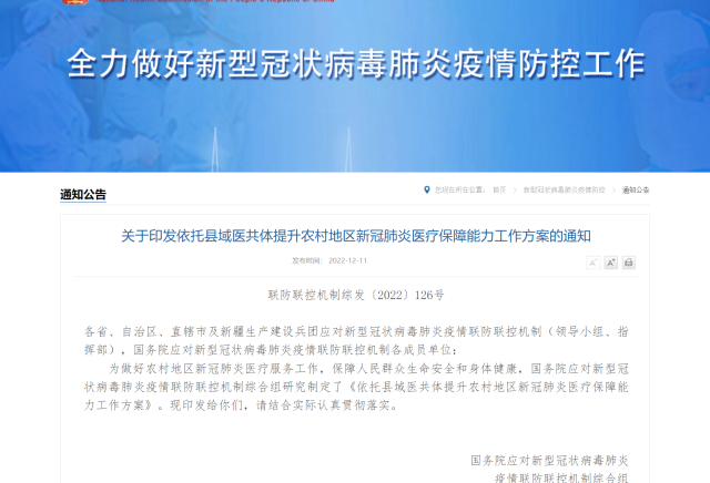 為做好農村地區新冠肺炎醫療服務工作,保障高齡合并基礎疾病等重癥風險較高的感染者及時救治,在農村地區,以縣域醫共體為載體,提升縣級醫院重癥救治能力,發揮鄉鎮衛生院和村衛生室健康監測作用,最大可能降低重癥率、病亡率,國務院聯防聯控機制11日發布《關于印發依托縣域醫共體提升農村地區新冠肺炎醫療保障能力工作方案的通知》(下稱“方案”)。