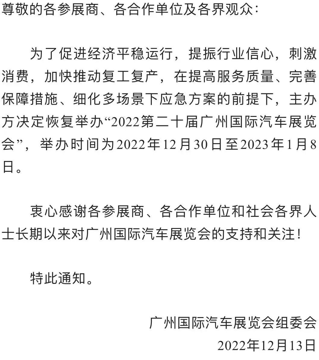 中新網12月13日電 據“廣州國際汽車展”公眾號消息,廣州國際汽車展覽會組委會12月13日發布通知,為了促進經濟平穩運行,提振行業信心,刺激消費,加快推動復工復產,在提高服務質量、完善保障措施、細化多場景下應急方案的前提下,主辦方決定恢復舉辦“2022第二十屆廣州國際汽車展覽會”,舉辦時間為2022年12月30日至2023年1月8日。(中新財經)