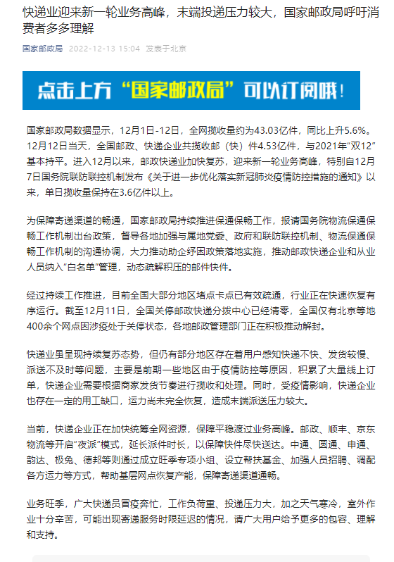 中新網(wǎng)12月13日電 據(jù)“國家郵政局”公眾號(hào)13日消息,當(dāng)前,快遞企業(yè)正在加快統(tǒng)籌全網(wǎng)資源,保障平穩(wěn)渡過業(yè)務(wù)高峰。郵政、順豐、京東物流等開啟“夜派”模式,延長(zhǎng)派件時(shí)長(zhǎng),以保障快件盡快送達(dá)。中通、圓通、申通、韻達(dá)、極兔、德邦等則通過成立旺季專項(xiàng)小組、設(shè)立幫扶基金、加強(qiáng)人員招聘、調(diào)配各方運(yùn)力等方式,幫助基層網(wǎng)點(diǎn)恢復(fù)產(chǎn)能,保障寄遞渠道通暢。(中新財(cái)經(jīng))