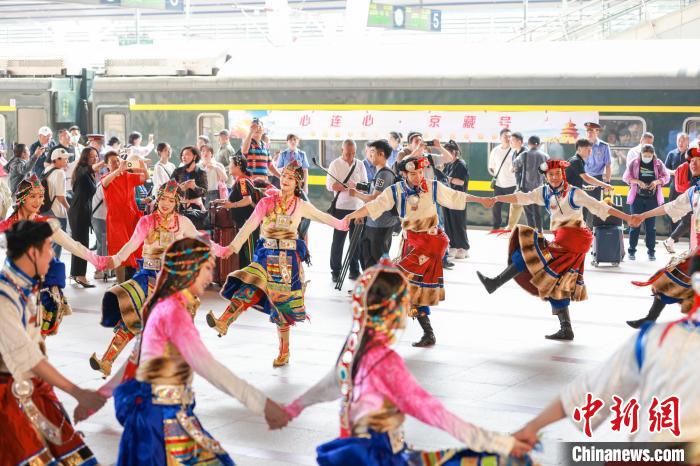 發車儀式上,大型藏族舞蹈表演歡迎游客乘車。記者 賈天勇 攝