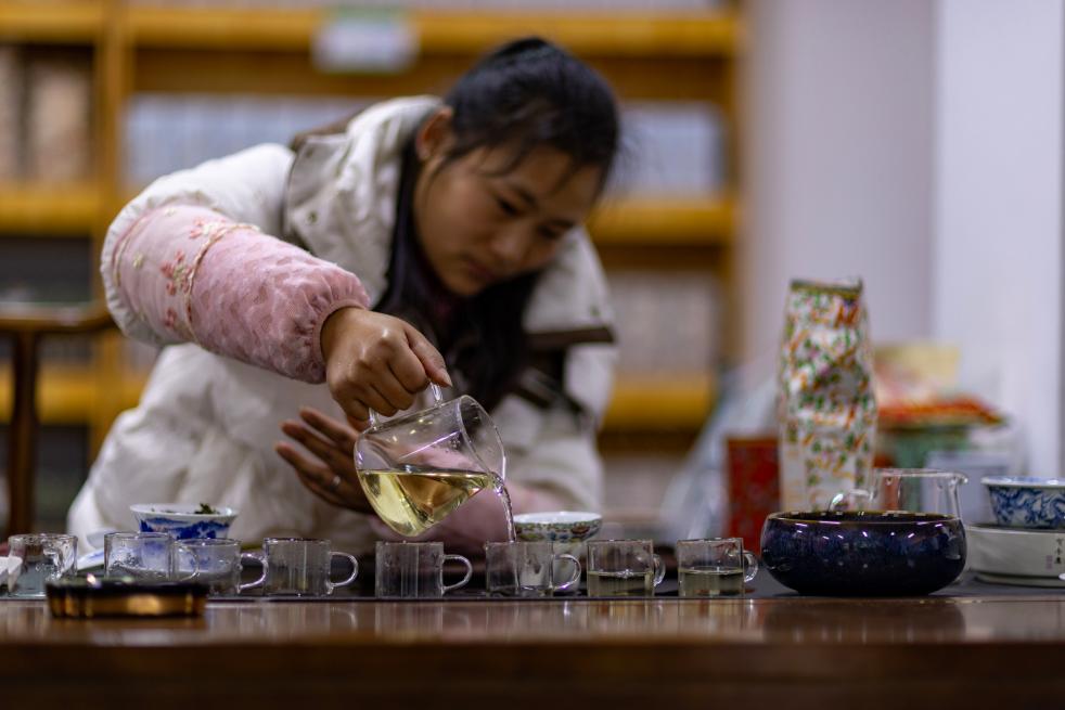 墨脫縣背崩鄉格林村村民袁美華在村里的特產銷售部給游客泡茶。新華社記者姜帆 攝