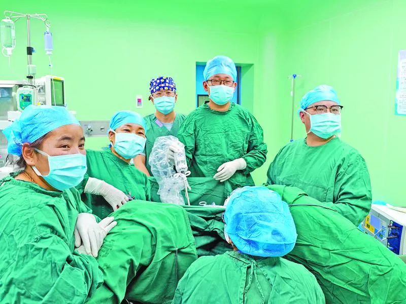 上海援藏醫療專家隋孟松(右一)帶領本地婦科醫生開展日喀則市首例腹腔鏡下全子宮切除手術。