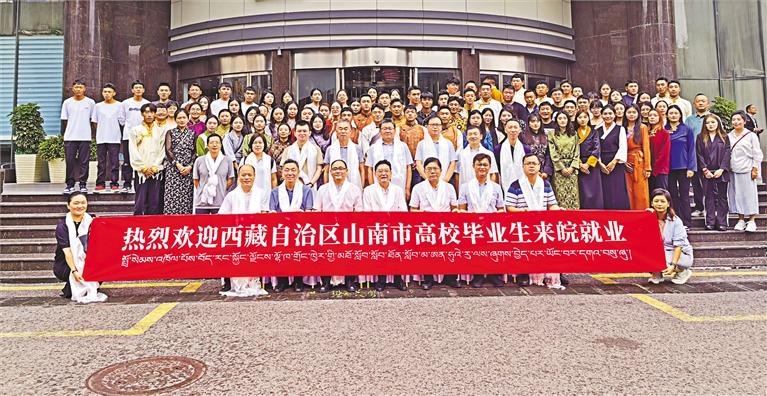 2023年9月,106名西藏籍高校畢業生組團赴安徽省就業,在全區實現首個百人以上規模的“大組團”區外市場化就業目標。 圖為西藏籍高校畢業生抵達安徽后合影留念。