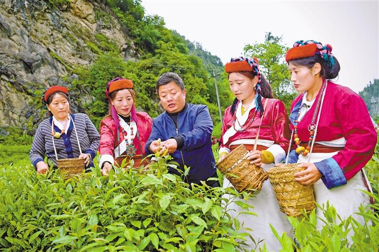 錯那市勒布溝,安徽第七批援藏隊隊員裴含龍指導門巴族村民規范采摘茶葉。