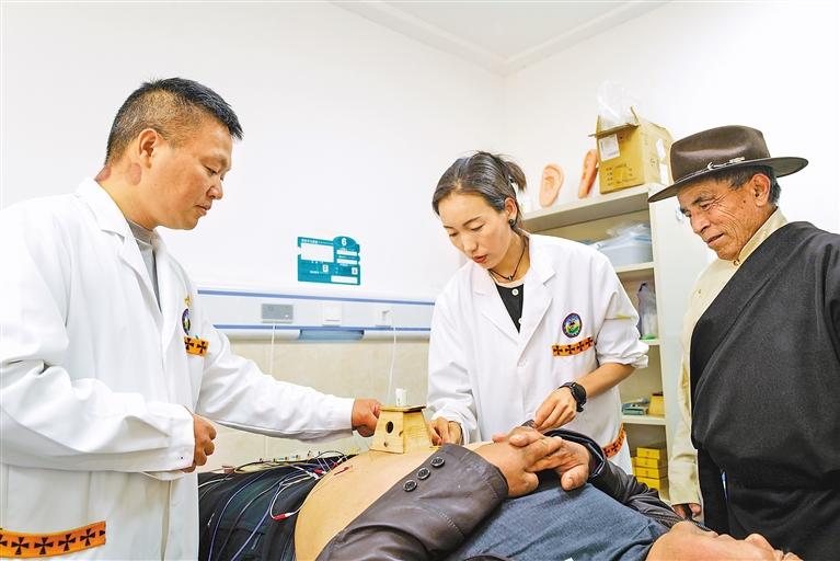 圖為在昌都市察雅縣藏醫院,重慶市大足區人民醫院援藏醫生(左)與藏醫院醫生結合中醫與藏醫療法,為患者進行診治。 記者 丹增群培 攝