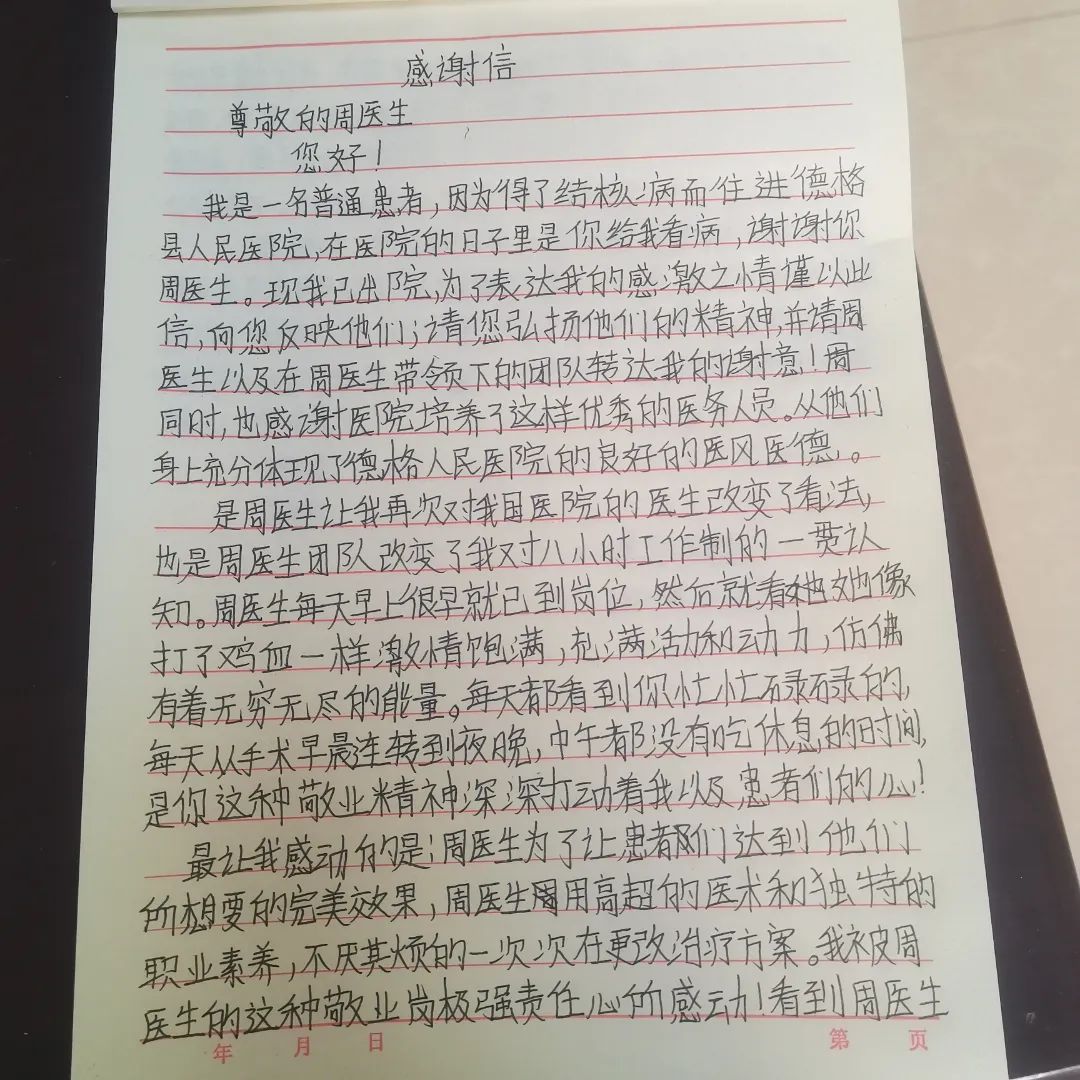 7月1日,一名在德格縣人民醫(yī)院就診的結(jié)核患者向成都市公共衛(wèi)生臨床醫(yī)療中心援藏醫(yī)師周瑜送來了一封感謝信,在信中,患者對周瑜醫(yī)生及其團隊在住院期間給予她的積極診治和熱情關(guān)懷表示感謝,并對科室團隊的診療技術(shù)和治療的預(yù)后效果都作出了非常高的評價。