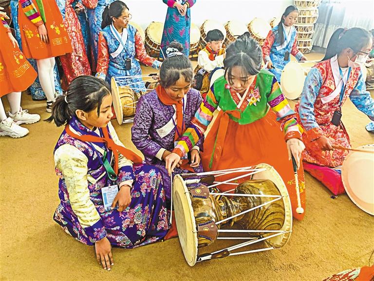 在“吉藏一家親”冬令營活動中,日喀則學生在朝鮮族學生指導下學習打鼓。