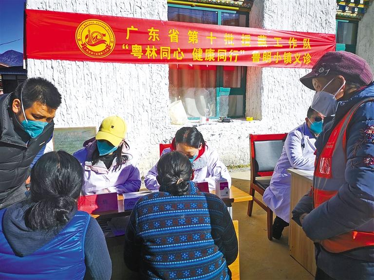 廣東省第十批援藏工作隊(duì)“組團(tuán)式”援藏醫(yī)生在魯朗小鎮(zhèn)為當(dāng)?shù)厝罕娺M(jìn)行“義診”。