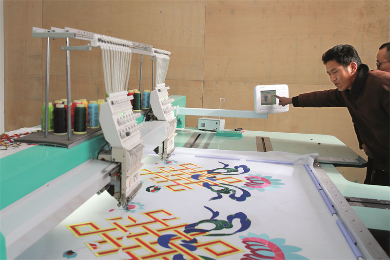 洛隆縣博織利民服飾有限公司總經理向巴在操作電子刺繡機刺繡帳篷上的花紋圖案。陳衛國 攝