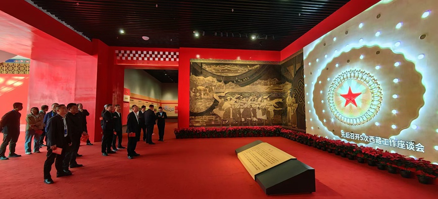 前廳布展氣勢恢宏,長城巍峨,雅江浩蕩。中庭是珠穆朗瑪峰模型,珠峰周圍花團(tuán)錦簇,象征西藏各族干部群眾緊密團(tuán)結(jié)在黨中央周圍,踔厲奮發(fā)、勇攀高峰。序廳播放的是全國對口援藏30周年8分鐘的專題片。右側(cè)的浮雕,展示的是以孔繁森為代表的援藏干部人才響應(yīng)黨中央號召,投身援藏事業(yè)。左側(cè)的浮雕,展現(xiàn)了新時代西藏重大基礎(chǔ)設(shè)施發(fā)展成果,各族人民載歌載舞歌頌幸福美好的新生活。