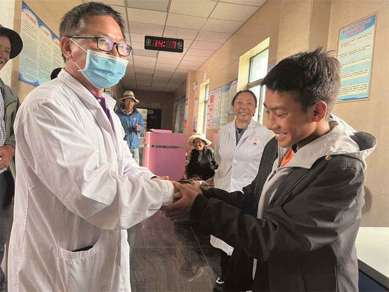 桑丁與張新輝醫生握手表達感謝。德吉卓瑪 攝