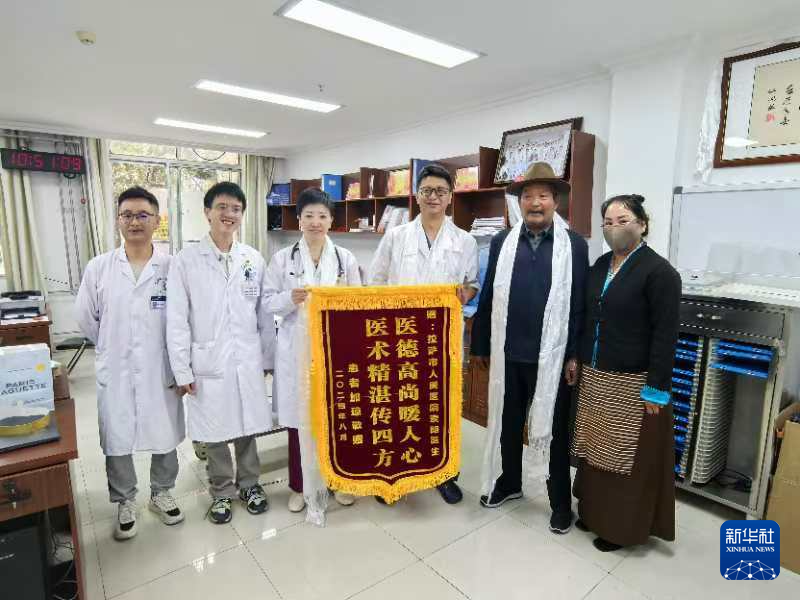 “突切囊,突切囊(非常感謝)。”患者加瓊即將離院之際,特意向主治醫(yī)生索朗和郭麗珠獻上哈達和錦旗。