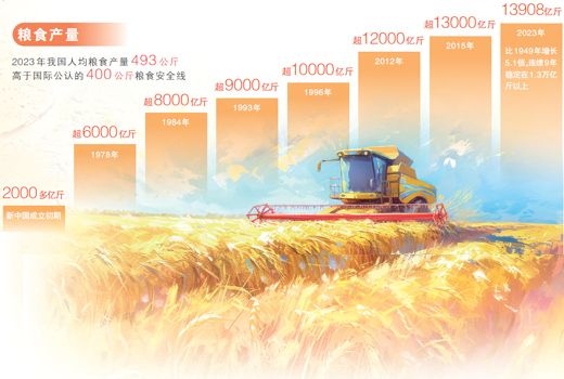 豐收成色十足。“藏糧于地、藏糧于技”戰略深入實施,我國糧食綜合生產能力穩步提升,連續9年穩定在1.3萬億斤以上。截至2023年,全國綠色、有機、名特優新和地理標志農產品認證登記總數達到7.5萬個。蔬菜水果品種琳瑯滿目,居民的“菜籃子”“果盤子”更加豐富。