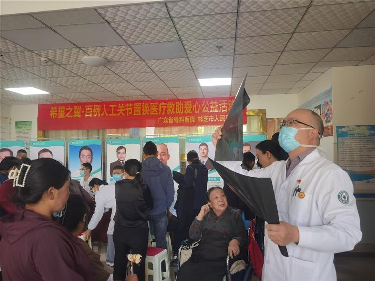 廣東援藏醫(yī)生在百例人工關(guān)節(jié)置換醫(yī)療救助愛(ài)心公益活動(dòng)中查看片子。