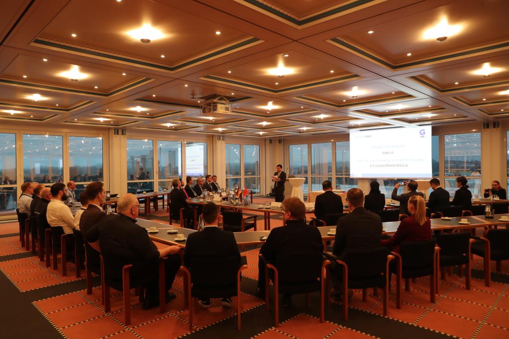 中國江蘇省太倉市2024年1月22日在德國北威州貝庫姆市為落戶的第500家德企伯曼集團舉行授牌儀式。新華社記者杜哲宇攝