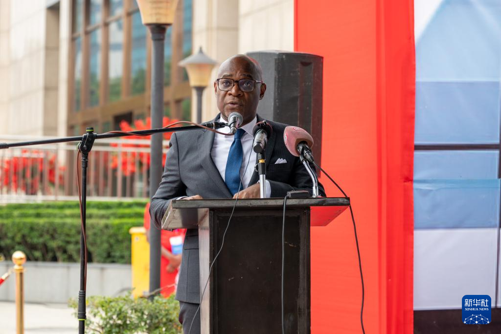 7月11日,剛果(布)財政、預算和國庫部長克里斯蒂安·約卡在布拉柴維爾舉行的中剛非洲銀行開業十周年慶?;顒由现罗o。新華社記者 鄭揚子 攝
