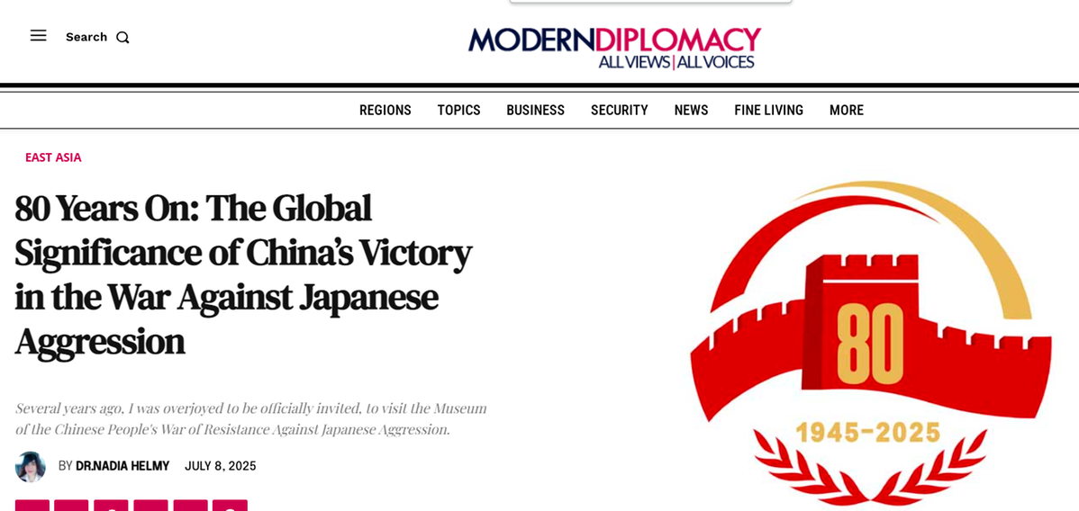 赫勒米教授在題為《80年過(guò)去:中國(guó)抗日戰(zhàn)爭(zhēng)勝利的世界意義》的文章中表示,中國(guó)抗戰(zhàn)勝利不僅是中華民族自強(qiáng)不息的壯舉,更為世界反法西斯戰(zhàn)爭(zhēng)勝利作出巨大貢獻(xiàn),中國(guó)所作的犧牲應(yīng)當(dāng)為全世界所銘記。