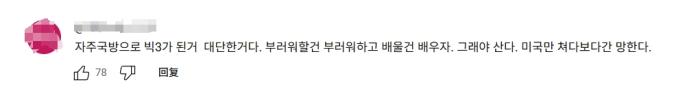 有韓國網友表示,對中國除了羨慕還是羨慕,韓國一定要向中國學習,如果(韓國)只看美國的眼色,就會“亡國”。