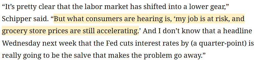 美國圣托馬斯大學副教授泰勒·施普爾 (Tyler Schipper)認為 :對普通消費者來說,耳邊最真切的聲音是“我的工作隨時可能保不住”,是“超市里的食品雜貨價格還在一個勁往上漲”。所以我實在不確定,下周“美聯儲降息”的頭條新聞,真能成為化解這些現實困境的良藥嗎?