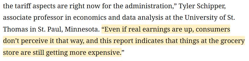 經濟學家泰勒 施皮珀(Tyler Schipper)直言:“老百姓感受不到工資上漲,他們只知道超市商品的價格越來越貴。”