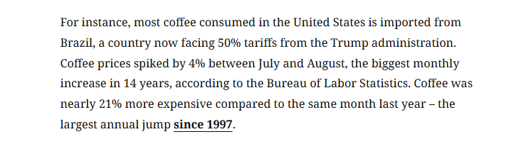 對于漲價,美國消費市場的現實數據中已有所體現:受對巴西征收50%關稅影響,咖啡價格在7月至8月間飆升4%,創14年來最大月度漲幅;對墨西哥西紅柿征收17%關稅后,8月美國西紅柿價格漲幅達4%。