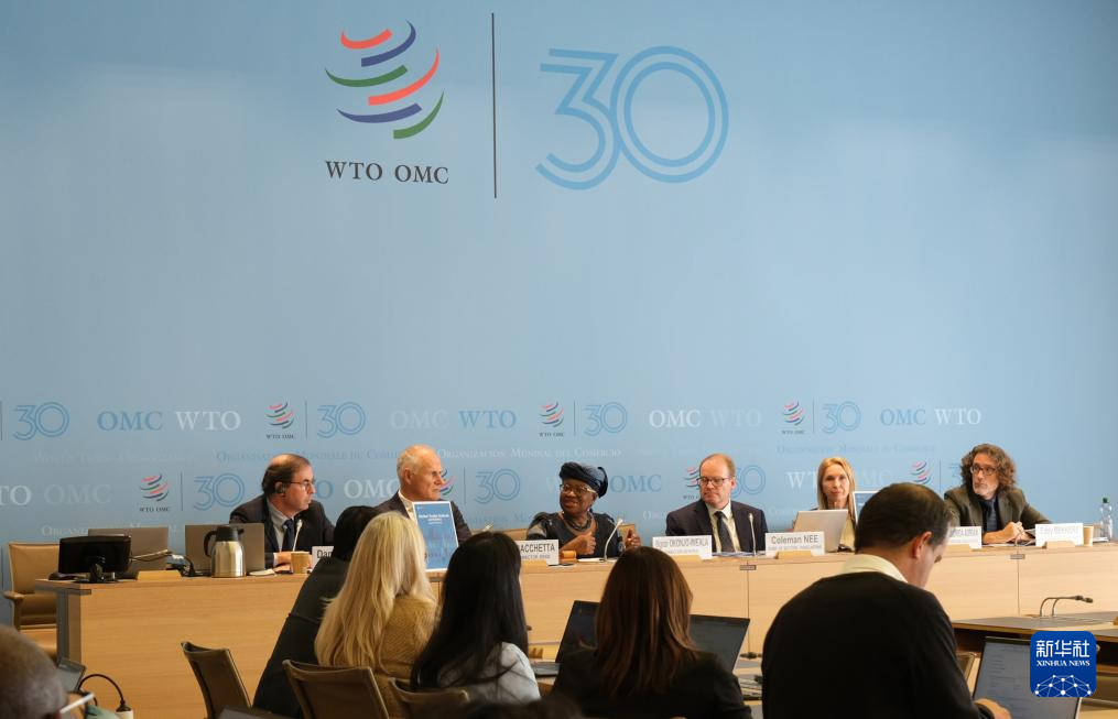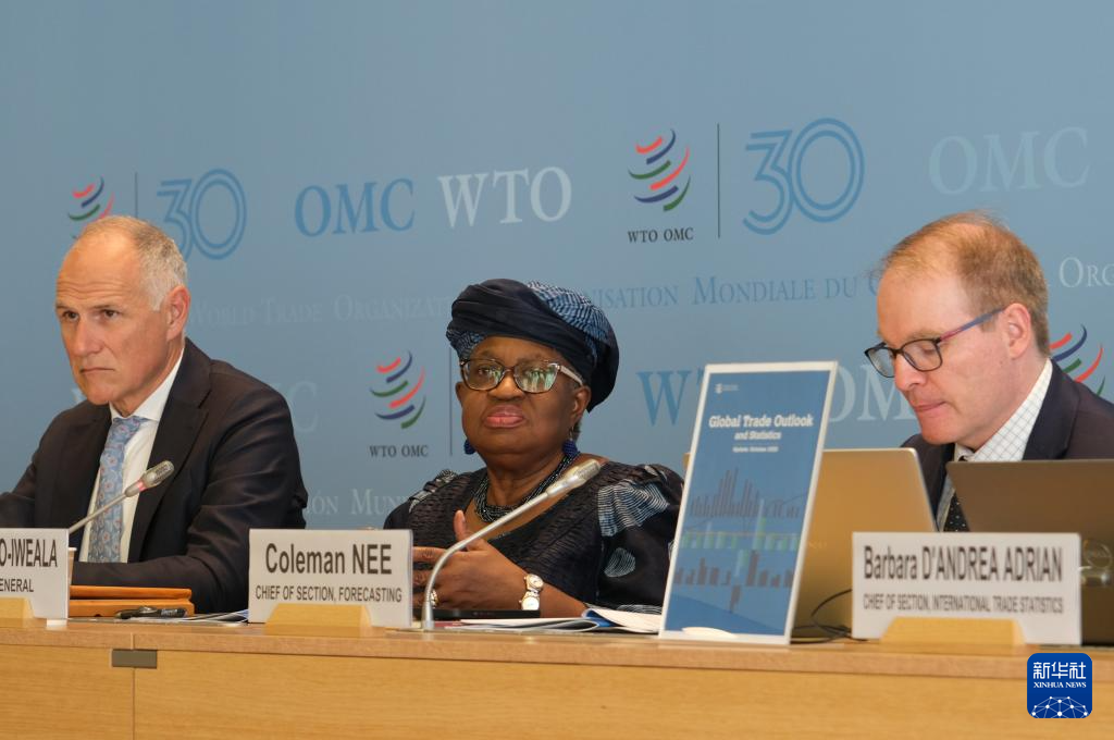 10月7日,在瑞士日內(nèi)瓦世界貿(mào)易組織總部,世貿(mào)組織總干事伊維拉(中)在新聞發(fā)布會(huì)上講話。新華社記者 馬汝軒 攝
