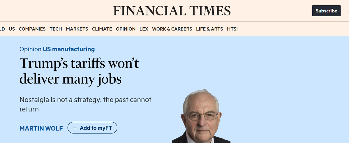 英國《金融時報》副總編及首席經濟評論員馬丁·沃爾夫(Martin Wolf)8日發表評論文章稱,事實表明,特朗普政府推行的貿易保護主義政策,并未兌現其對選民所作的核心承諾——為美國創造大量制造業就業崗位,尤其是面向那些曾經依賴傳統工業、如今卻面臨地區經濟衰落困境的工人群體。他進一步指出,這一承諾本質上是空洞的,其政策實質是為政府自身及其背后的富豪階層牟取利益。