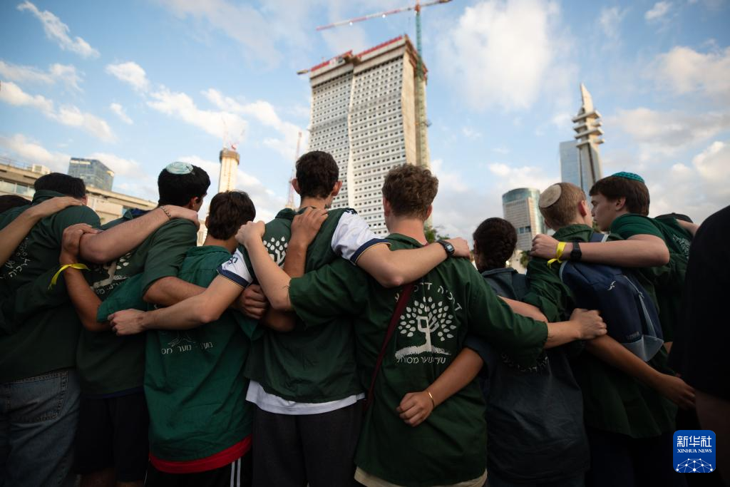 10月9日,在以色列特拉維夫,人們獲悉加沙停火協議的消息后相互慶祝,期待被扣押的人員早日獲釋。新華社記者 陳君清 攝