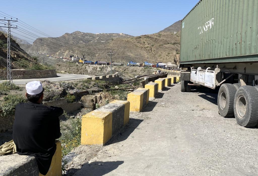 10月13日,在巴基斯坦與阿富汗的邊境口岸多爾哈姆,卡車因邊境地區沖突而滯留。新華社發