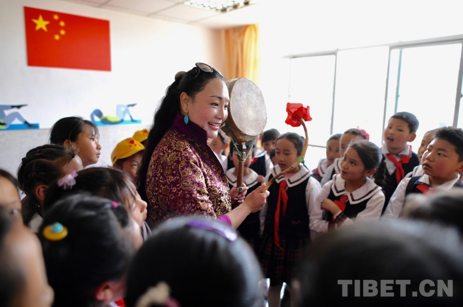 圖為“熱巴皇后”澤吉在拉薩實驗小學給孩子們講解熱巴舞蹈的歷史。攝影:普布扎西