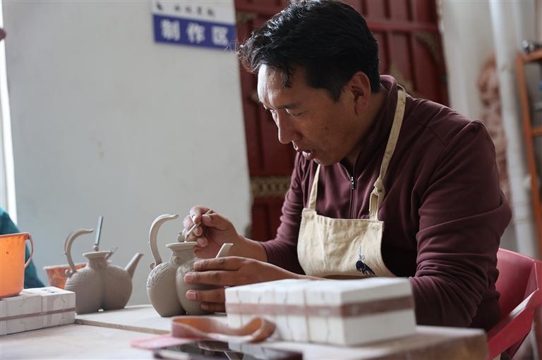 公司實行“按勞計酬”的薪酬制度,為員工提供了穩定的收入保障。這份“家門口”的可觀收入,讓員工們穩穩撐起了家庭的幸福生活?!耙郧霸诩曳N地,收入沒著落,現在在公司做黑陶,不僅學到了一門手藝,每個月還有固定工資,日子越過越有盼頭了!”作為曲珠的第一批學生,扎西如今已能獨立設計制作復雜的黑陶茶具,月薪穩定在5000元,他的感慨道出了所有員工的心聲。這些扎根鄉土的手藝人,不僅用雙手改變了自身生活,更因對這門技藝的熱愛與堅守,成為察雅黑陶傳承路上的重要力量。