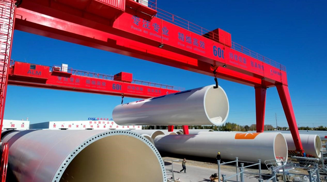 蒙東(通遼)風電裝備制造產業基地內,一排排風葉和塔筒即將運往全國各地。林林攝