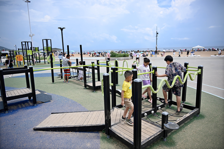 8月14日,小朋友在青島嶗山區(qū)石老人海水浴場(chǎng)健身游樂(lè)區(qū)玩耍。新華社記者 李紫恒 攝