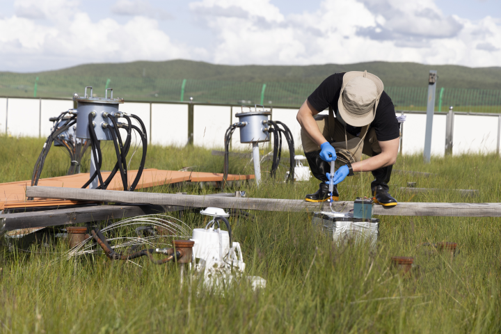 7月25日,科研人員在若爾蓋日干喬濕地一處試驗(yàn)平臺(tái)采取氣體樣本。新華社記者 金立旺 攝