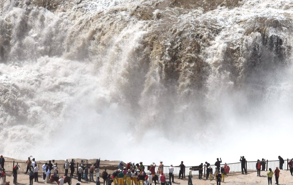 2025年4月9日,游客在山西吉縣黃河壺口瀑布景區欣賞壯美的“桃花汛”。