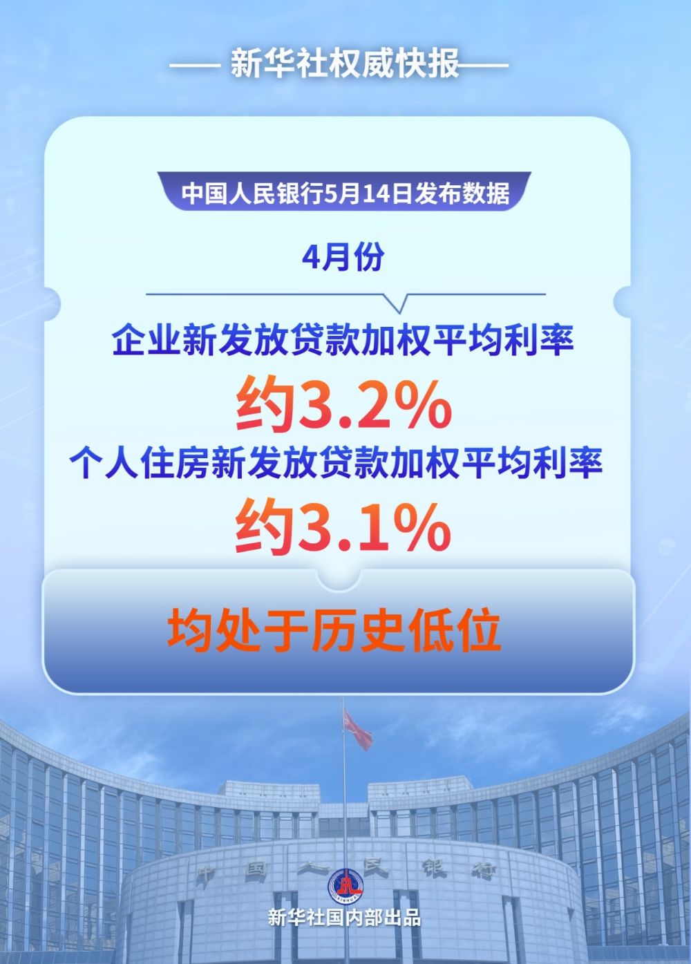中國人民銀行的數據顯示,4月份,企業新發放貸款加權平均利率約3.2%,比上年同期低約50個基點;個人住房新發放貸款加權平均利率約3.1%,比上年同期低約55個基點,均處于歷史低位。