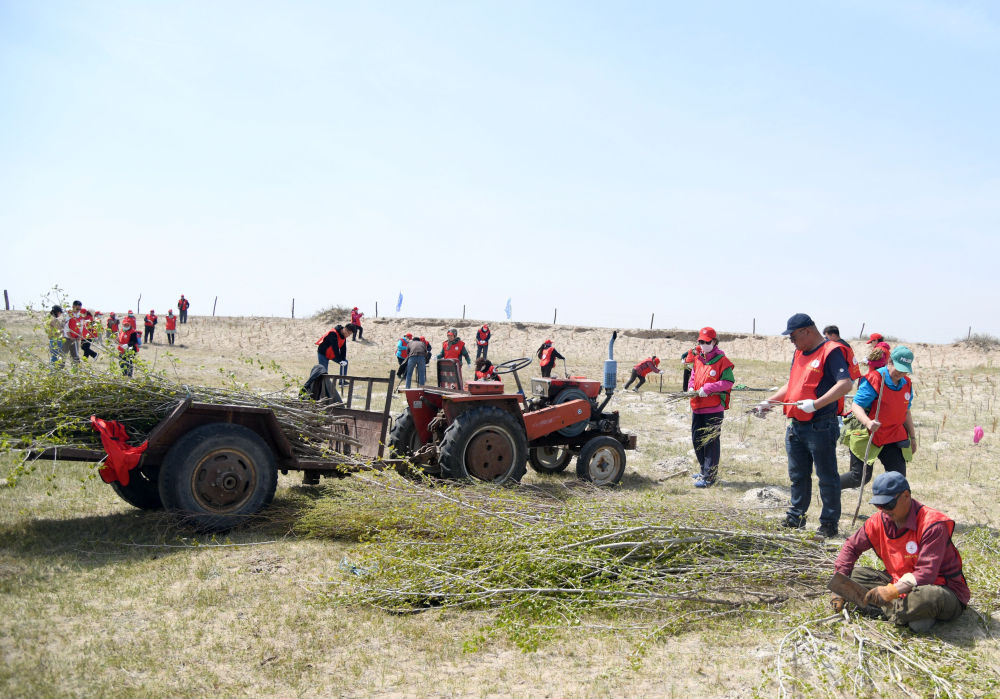 人們在地處渾善達克沙地的正藍旗寶紹岱蘇木開展植綠活動。新華社 發(fā)