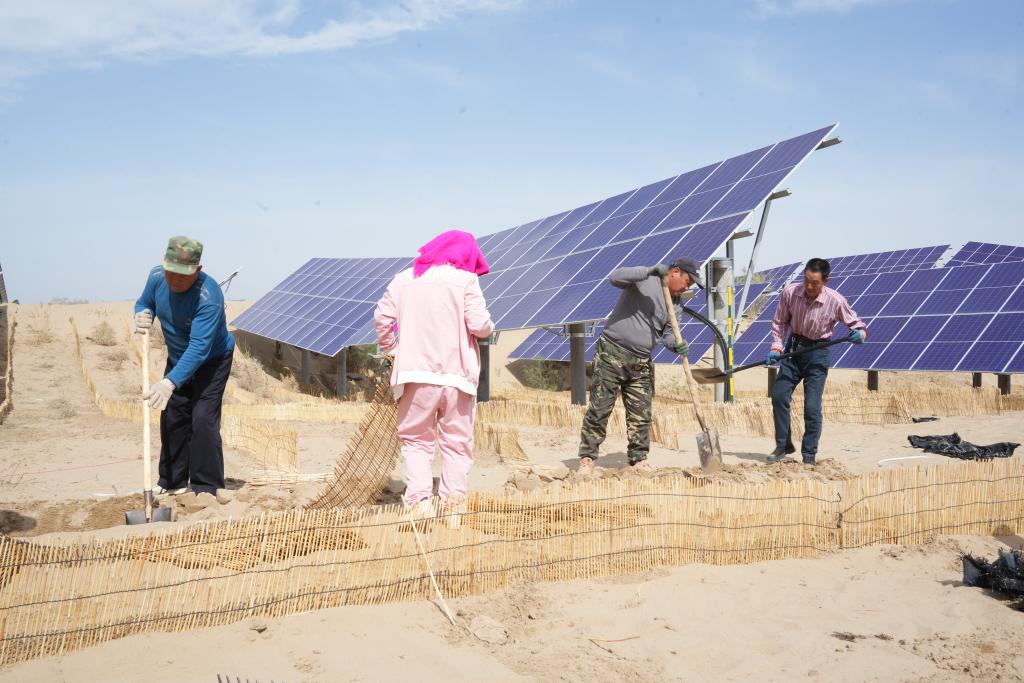 連日來,地處黃河“幾字彎”北岸的巴彥淖爾市臨河區新華林場光伏治沙項目區機器轟鳴,新華鎮隆光村村民吳瑞喜和其他村民利用夯土機打地基。“現在,我們種的小麥剛抽穗、玉米已澆水,村民們趁著農閑到這里打工,一天能掙300元,大家參與防沙治沙的積極性都很高。”吳瑞喜說。