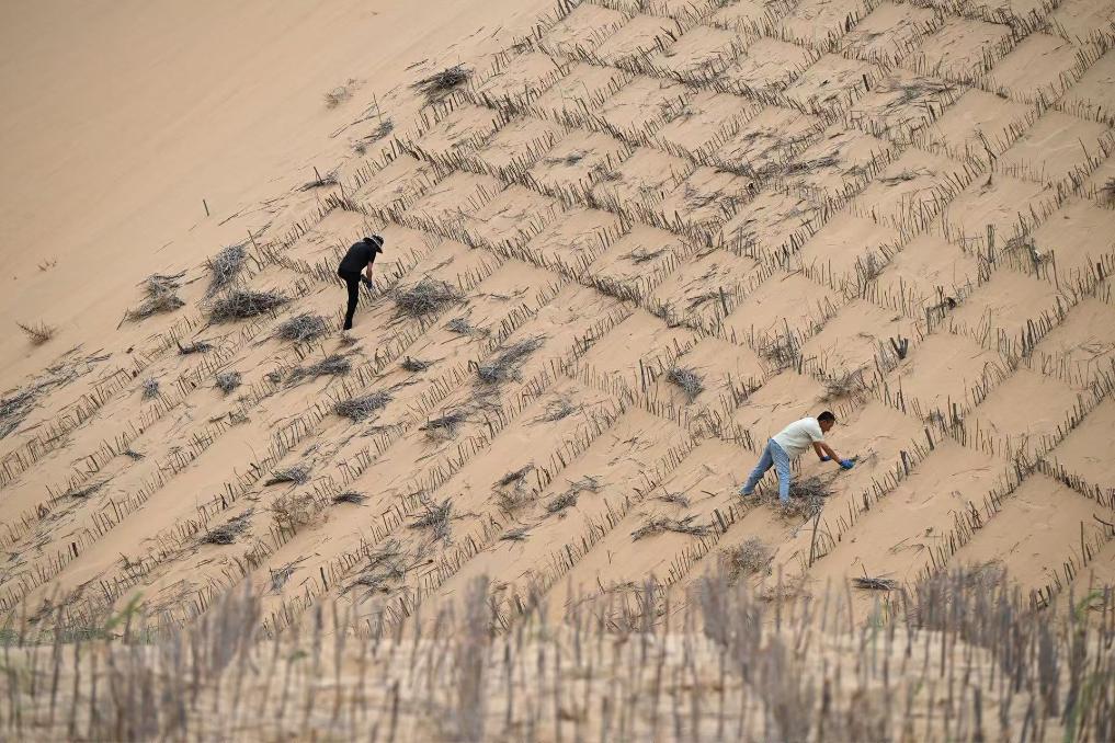 鄂爾多斯市達拉特旗農民在防沙治沙項目區鋪設沙障。新華社發(楊耀中 攝)
