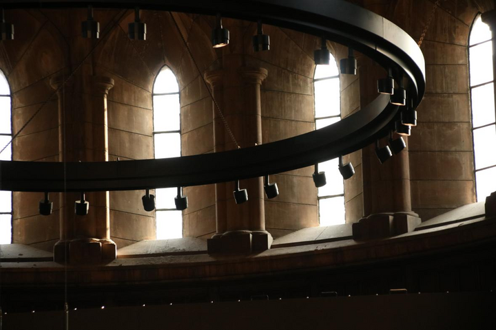 在原來祭臺的中間,現在改造為演講、演奏的環形中心臺。上方是一個中央環形燈,在沒亮燈之前就像一條烏黑色的緞帶,神秘且漂亮。