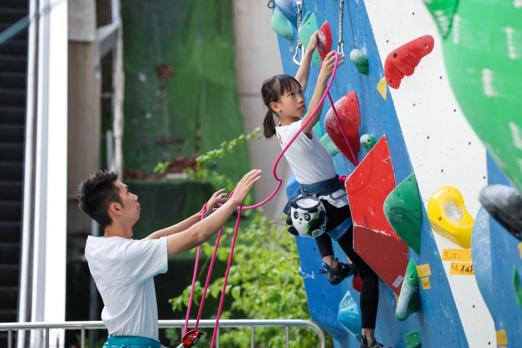 圖為在深圳福田區(qū)呢度有家攀巖館,來自中國(guó)香港的9歲女孩何芊芊(右)在爸爸何善揮的保護(hù)下開始難度攀巖訓(xùn)練(6月17日攝)。新華社記者 梁旭 攝
