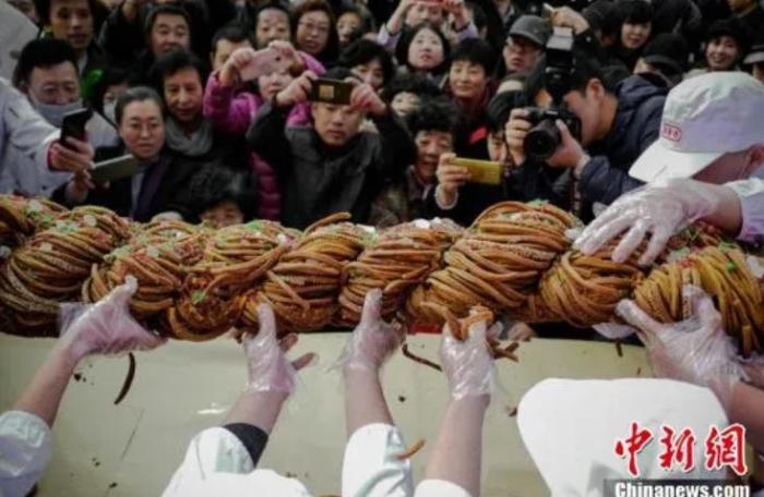 11月18日,天津麻花文化節在天津意式風情街桂發祥十八街麻花體驗店舉行,消費者共同分享了一支重118斤的巨型麻花