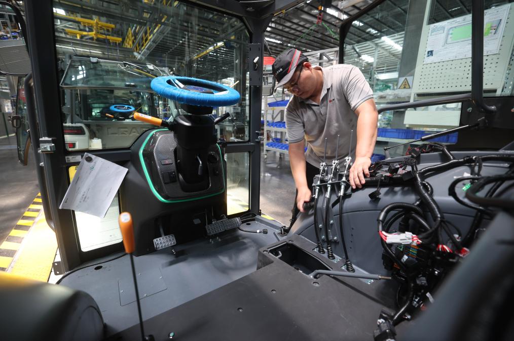 7月27日,工人在山東省臨沂市蘭山區臨工智慧農機裝備產業園的流水線上組裝拖拉機。新華社發(王彥冰攝)