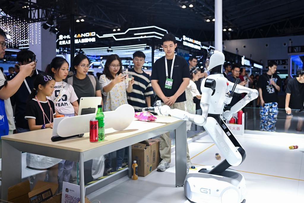 7月29日,上海2025世界人工智能大會,參觀者在觀賞一款可用于零售、工業等多種場景的機器人。新華社記者 陳浩明 攝