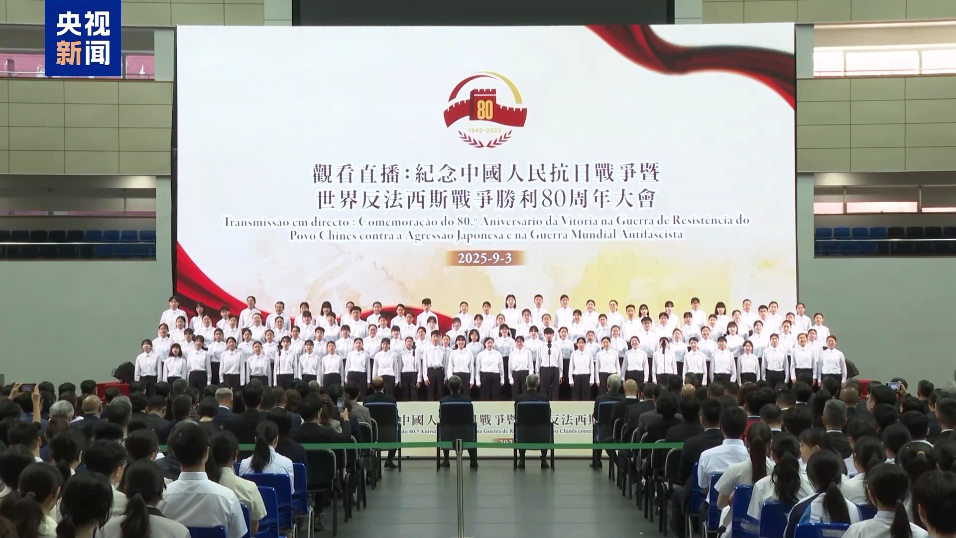 9月3日上午8時,香港特區政府在香港大會堂紀念花園舉行官方儀式,紀念中國人民抗日戰爭暨世界反法西斯戰爭勝利80周年。澳門特區政府于9月3日上午,在澳門理工大學和澳門大學同步舉行儀式,組織特區政府官員、社團、青年和學生代表等社會各界人士共同觀看紀念中國人民抗日戰爭暨世界反法西斯戰爭勝利80周年大會的直播。
