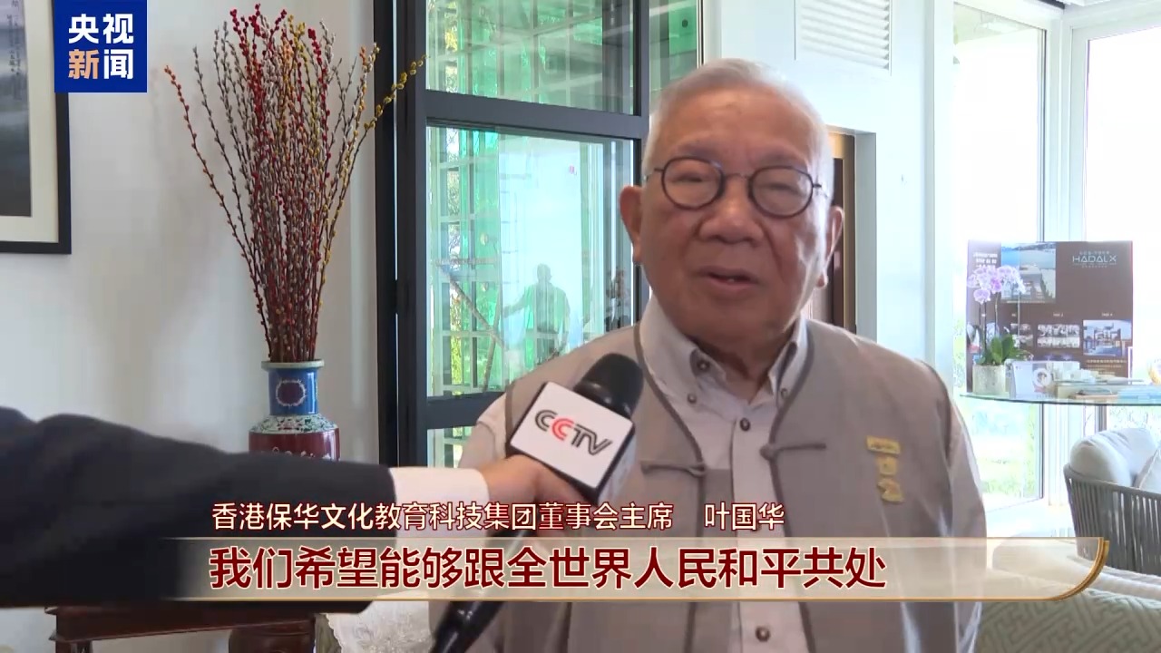 香港保華文化教育科技集團董事會主席 葉國華:我一般看電視都坐著。今天我不是坐著而是站著。因為我用最尊敬的心來看。習近平主席講話精神是,我們希望能夠跟全世界人民和平共處,能夠以構建人類命運共同體來帶動全球。