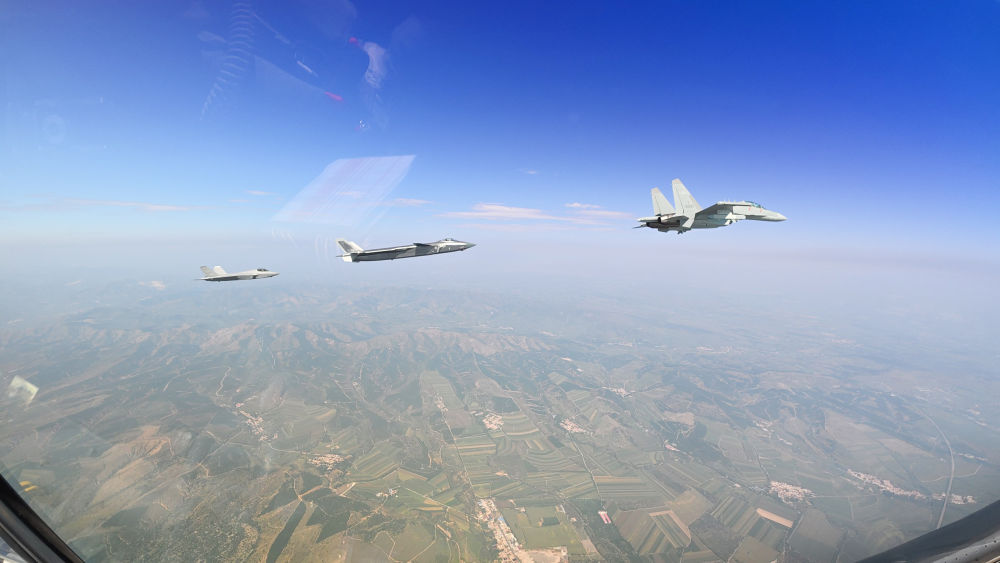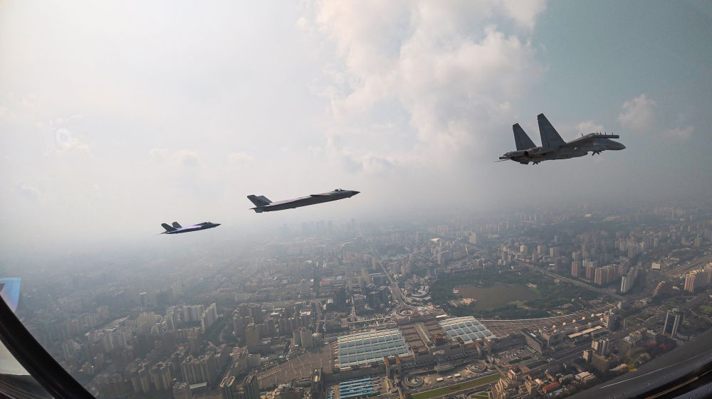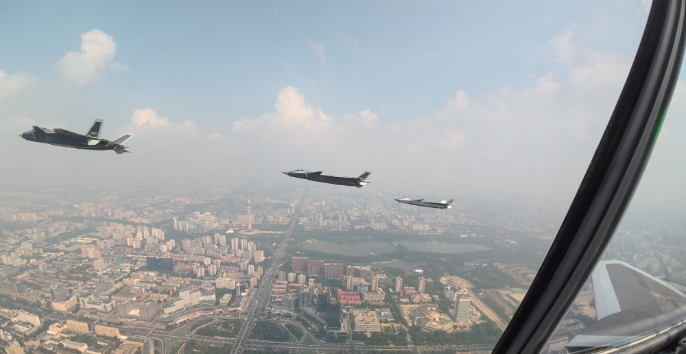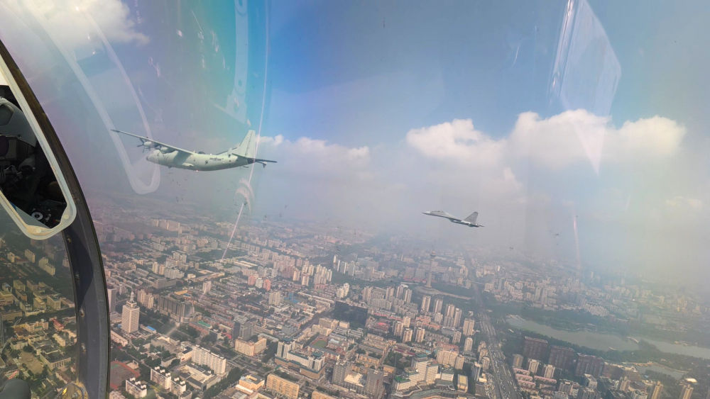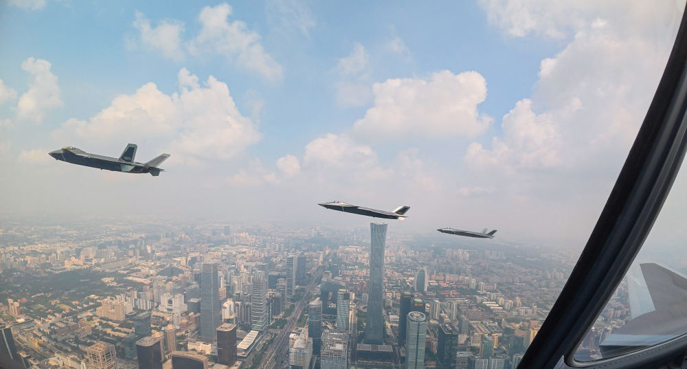 ↑這是殲擊機(jī)梯隊(duì)從北京城區(qū)上空飛過(guò)。