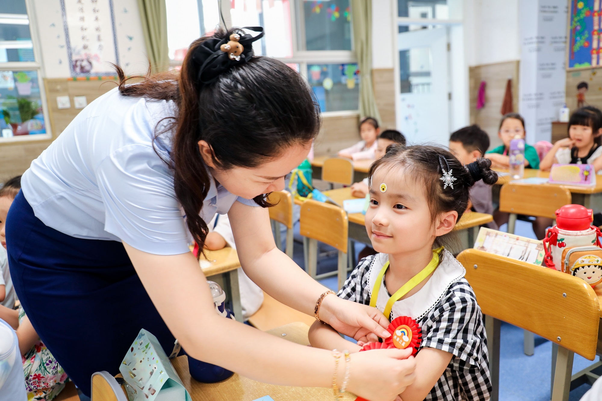 老師為新生帶上獎勵的“小勛章”(央廣網發 西安高新第八小學供圖)
