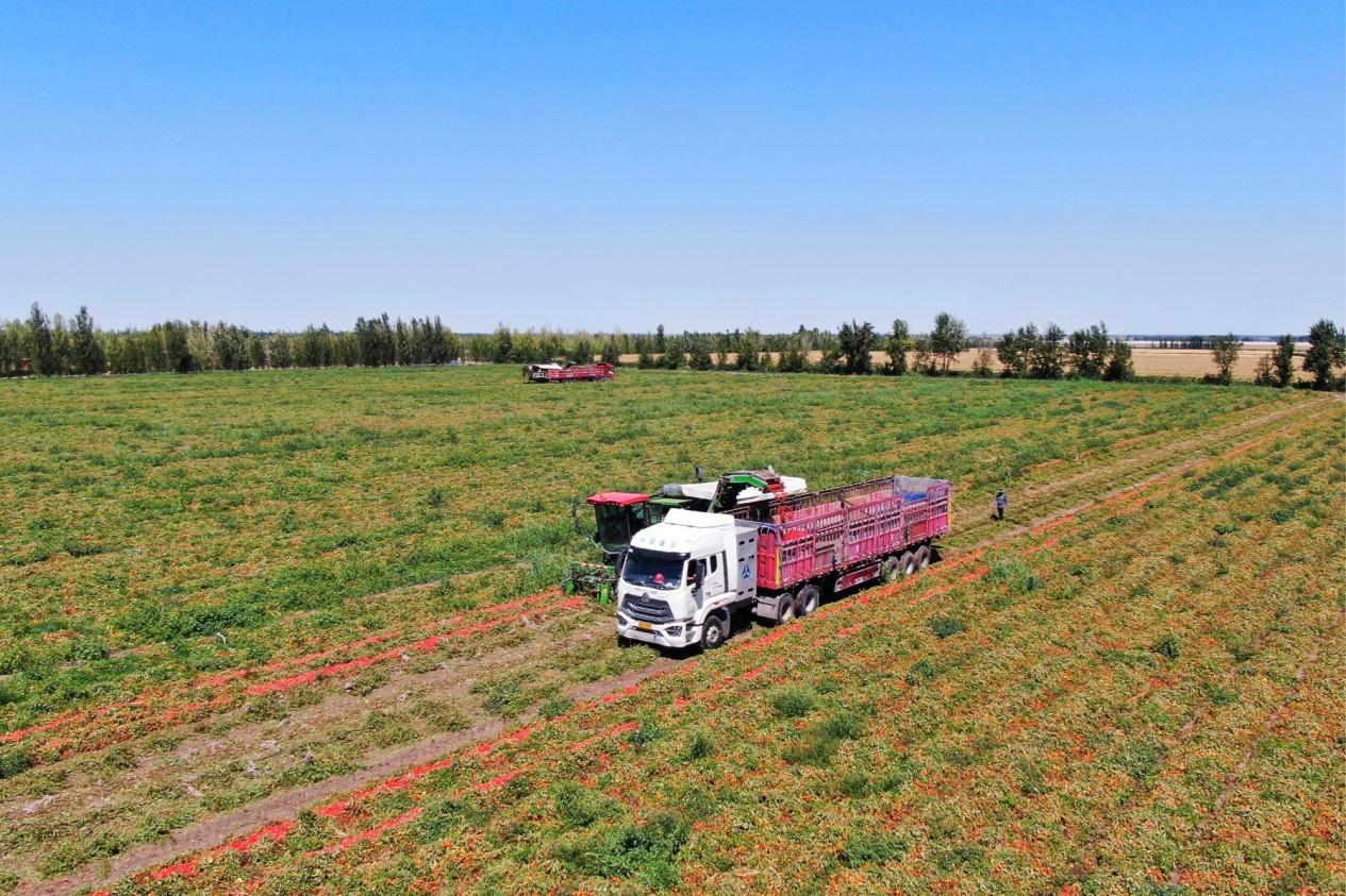吉木薩爾縣三臺鎮的1200余畝加工番茄迎來了豐收季。在羊圈臺子村,種植戶俞瑞海家的300畝番茄地里,現代化采收機械正來回穿梭。