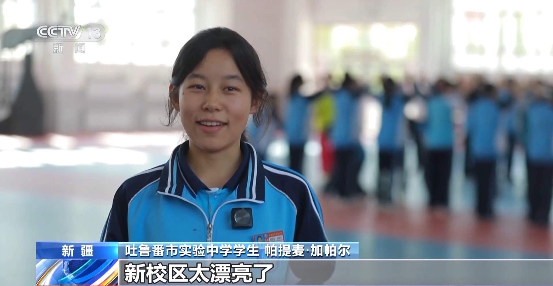 吐魯番市實驗中學學生 帕提麥·加帕爾:新校區太漂亮了,在這里我現在學習勁頭兒十足,已經愛上這里的生活了。